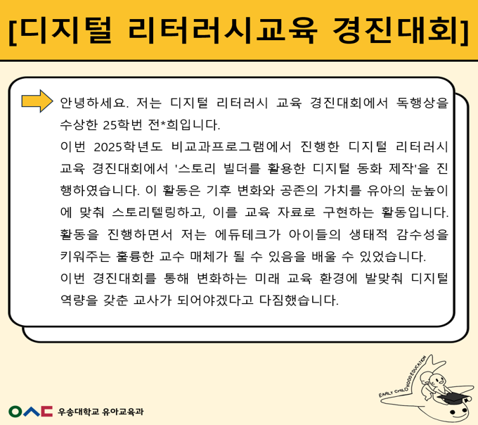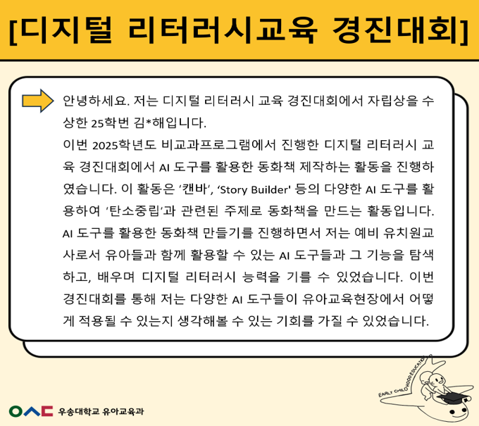학생활동 지금유아교육과에서는! 학생들의 학과소개 글로벌프로그램 학생회 동아리 유아교육과 뉴스레터 생생 유아교육 지금유아교육과에서는!Home학생활동지금유아교육과에서는! 전체 비교과프로그램 교과수업 학술제 디지털 리터러시 교육 경진대회 카테고리 : [비교과프로그램]| 작성자 : 학과관리자 | 작성일 : 2026.01.07 | 조회수 : 34 첨부파일 디지털 리터러시 교육 경진대회_썸네일.png 디지털 리터러시 교육 경진대회1.png 디지털 리터러시 교육 경진대회2.png 디지털 리터러시 교육 경진대회3.png 디지털 리터러시 교육 경진대회4.png 디지털 리터러시 교육 경진대회5.png 디지털 리터러시 교육 경진대회6.png 디지털 리터러시 교육 경진대회7.png 디지털 리터러시 교육 경진대회8.png 디지털 리터러시 교육 경진대회9.png 디지털 리터러시 교육 경진대회10.png 디지털 리터러시 교육 경진대회11.png 디지털 리터러시 교육 경진대회12.png 디지털 리터러시 교육 경진대회13.png 목록 이전글 북아트, 팝업북 작품 경진대회 다음글 고인쇄박물관 견학