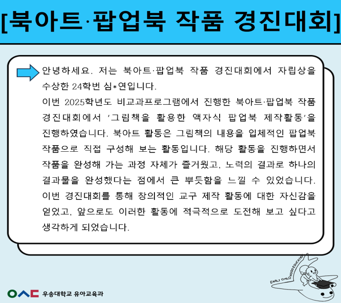 학생활동 지금유아교육과에서는! 학생들의 학과소개 글로벌프로그램 학생회 동아리 유아교육과 뉴스레터 생생 유아교육 지금유아교육과에서는!Home학생활동지금유아교육과에서는! 전체 비교과프로그램 교과수업 학술제 북아트, 팝업북 작품 경진대회 카테고리 : [비교과프로그램]| 작성자 : 학과관리자 | 작성일 : 2026.01.07 | 조회수 : 33 첨부파일 북아트·팝업북 작품 경진대회_썸네일.png 북아트·팝업북 작품 경진대회1.png 북아트·팝업북 작품 경진대회2.png 북아트·팝업북 작품 경진대회3.png 북아트·팝업북 작품 경진대회4.png 북아트·팝업북 작품 경진대회5.png 북아트·팝업북 작품 경진대회6.png 북아트·팝업북 작품 경진대회7.png 북아트·팝업북 작품 경진대회8.png 북아트·팝업북 작품 경진대회9.png 북아트·팝업북 작품 경진대회10.png 북아트·팝업북 작품 경진대회11.png 북아트·팝업북 작품 경진대회12.png 북아트·팝업북 작품 경진대회13.png 북아트·팝업북 작품 경진대회14.png 목록 이전글 디지털 매체 활용 교육 경진대회 다음글 디지털 리터러시 교육 경진대회
