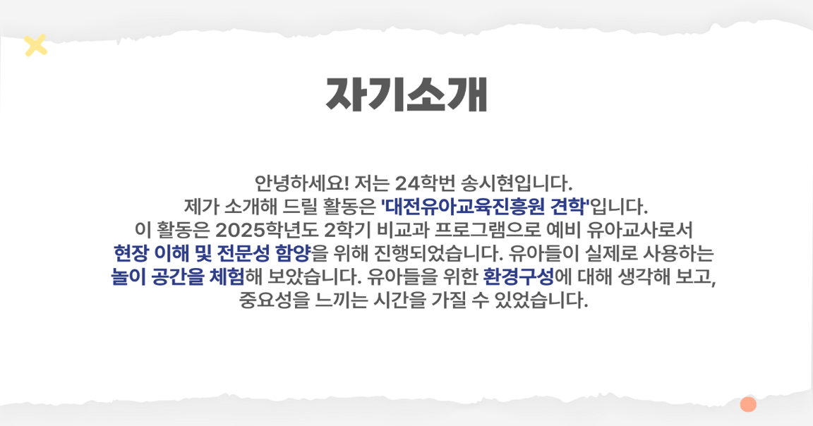학생활동 지금유아교육과에서는! 학생들의 학과소개 글로벌프로그램 학생회 동아리 유아교육과 뉴스레터 생생 유아교육 학생들의 학과소개Home학생활동학생들의 학과소개 202411596 송시현(2학년) 작성자 : 학과관리자 | 작성일 : 2026.01.13 | 조회수 : 21 첨부파일 202411596 송시현_썸네일.png 202411596 송시현1.png 202411596 송시현2.png 202411596 송시현3.png 202411596 송시현4.png 목록 이전글 202511839 전소희(1학년) 다음글 202211617 이연화(4학년)