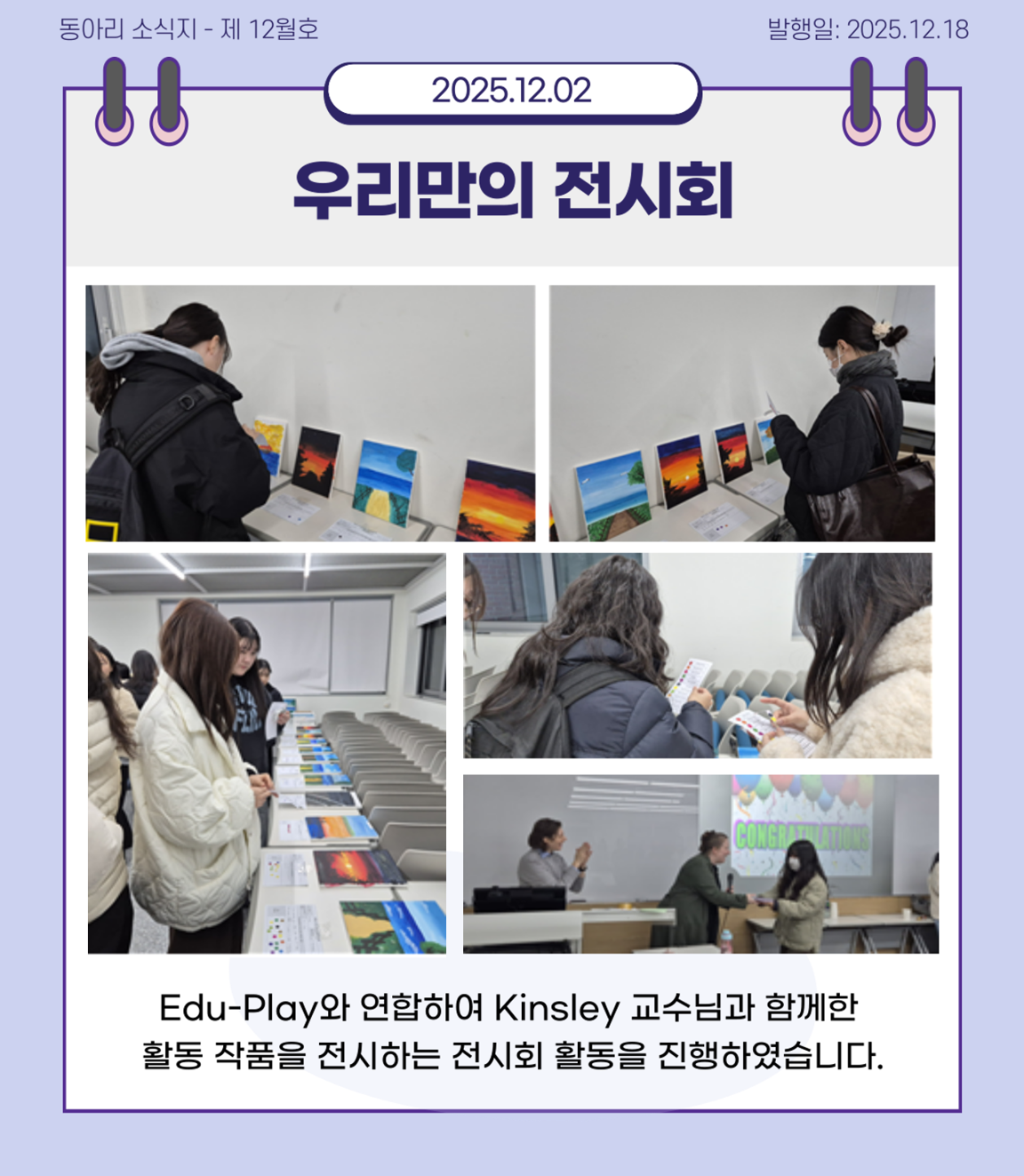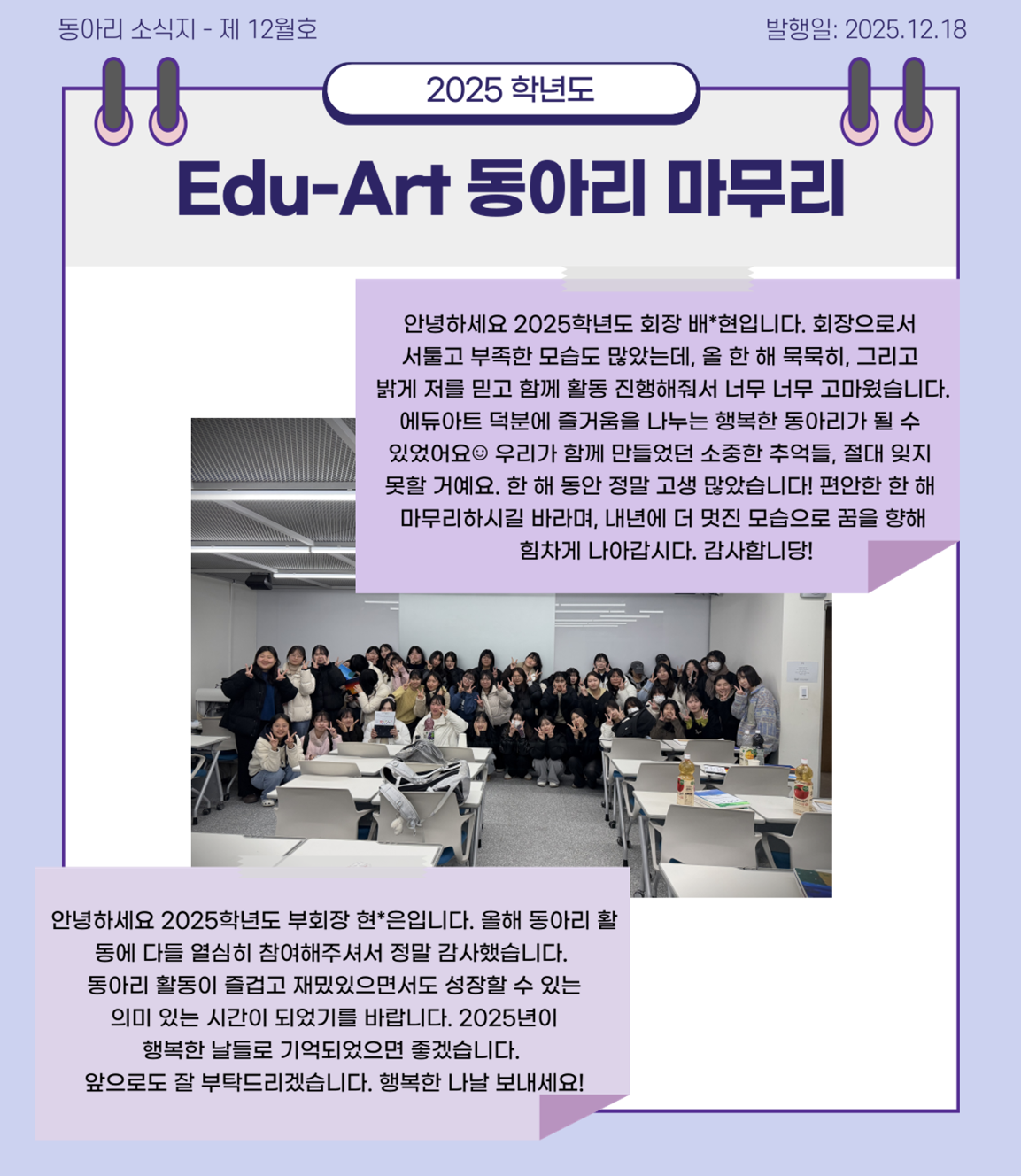 학생활동 지금유아교육과에서는! 학생들의 학과소개 글로벌프로그램 학생회 동아리 유아교육과 뉴스레터 생생 유아교육 동아리Home학생활동동아리 Edu-Play Edu-Art With-U Edu-Art미술, 음악, 동작 등 예술에 대한 이해와 경험을 바탕으로 예비유아교사로서 미적 소양을 함양시키기 위한 동아리입니다. 12월호 소식지 작성자 : 학과관리자 | 작성일 : 2025.12.22 | 조회수 : 65 첨부파일 [16]에듀아트_썸네일.png [34]에듀아트1.png [19]에듀아트2.png 목록