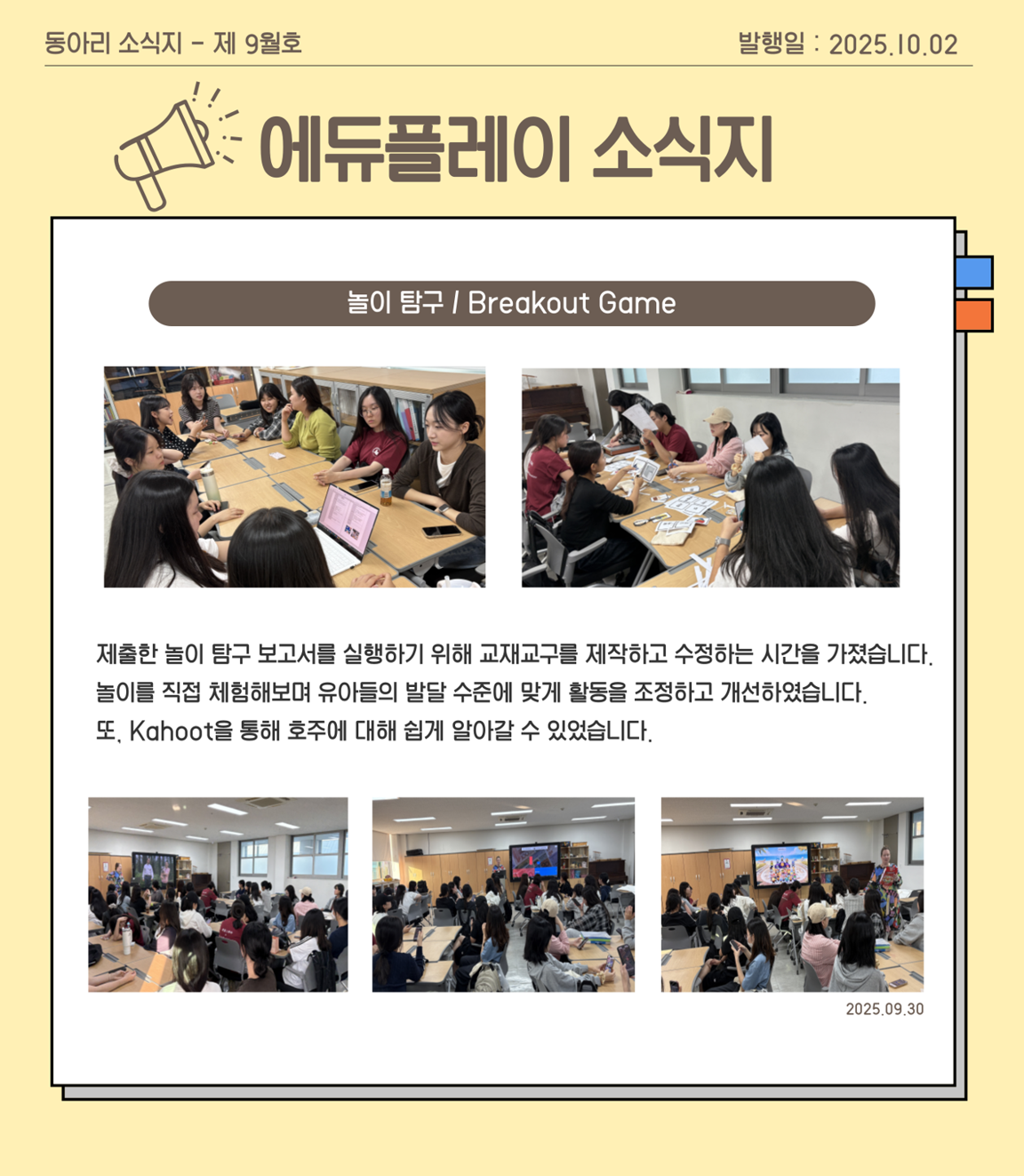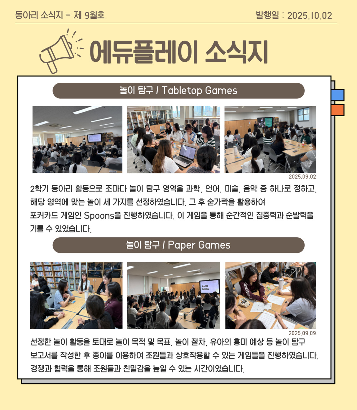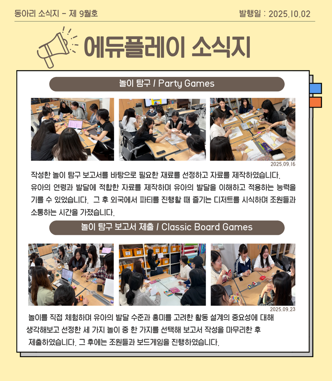 학생활동 지금유아교육과에서는! 학생들의 학과소개 글로벌프로그램 학생회 동아리 유아교육과 뉴스레터 생생 유아교육 동아리Home학생활동동아리 Edu-Play Edu-Art With-U Edu-Play놀이중심교육에 대한 이해와 실천역량을 함양하고 좋은 유치원교사가 되기 위한 핵심역량인놀이기반 수업을 올바르게 운영할 수 있는 능력을 형성하는 동아리입니다. 9월호 소식지 작성자 : 학과관리자 | 작성일 : 2025.10.10 | 조회수 : 105 첨부파일 [15]에듀플레이_썸네일.png [26]에듀플레이1.png [15]에듀플레이2.png [11]에듀플레이3.png [1]에듀플레이4.png 목록