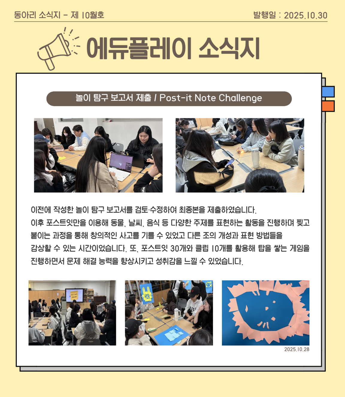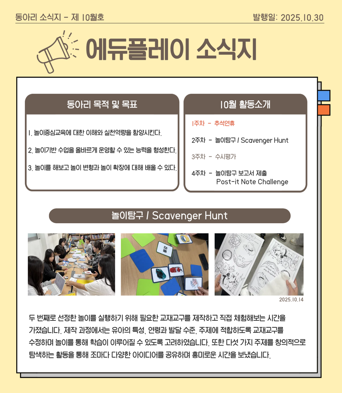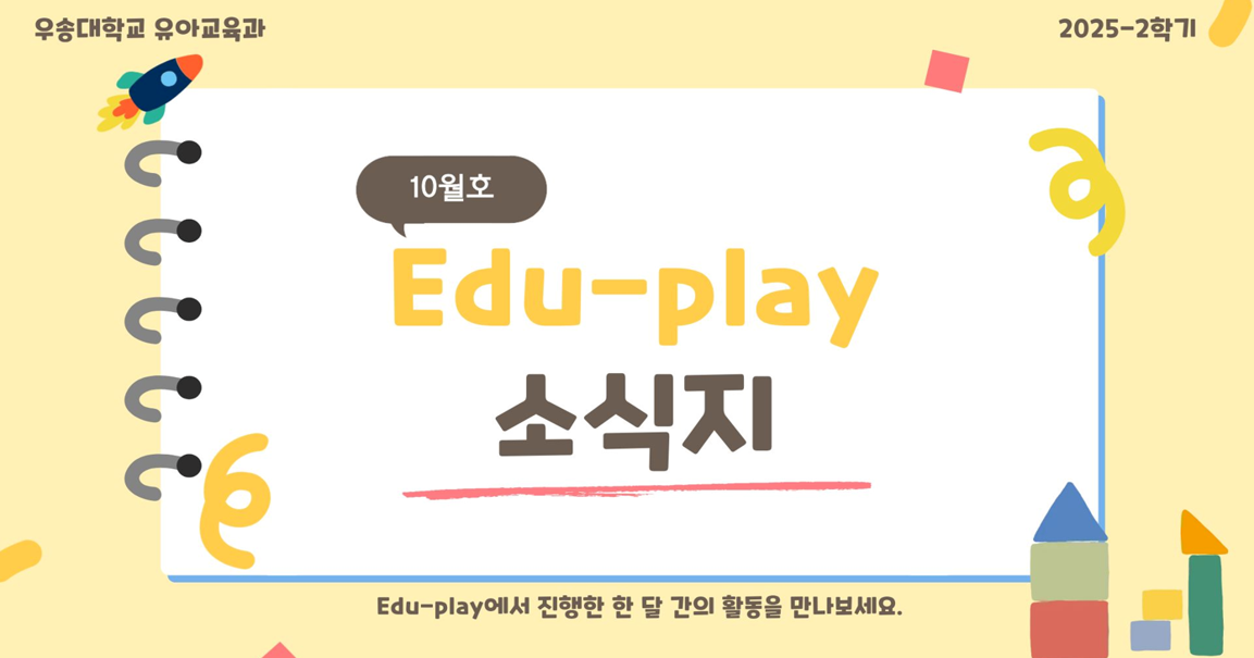 학생활동 지금유아교육과에서는! 학생들의 학과소개 글로벌프로그램 학생회 동아리 유아교육과 뉴스레터 생생 유아교육 동아리Home학생활동동아리 Edu-Play Edu-Art With-U Edu-Play놀이중심교육에 대한 이해와 실천역량을 함양하고 좋은 유치원교사가 되기 위한 핵심역량인놀이기반 수업을 올바르게 운영할 수 있는 능력을 형성하는 동아리입니다. 10월호 소식지 작성자 : 학과관리자 | 작성일 : 2025.10.31 | 조회수 : 27 첨부파일 [16]에듀플레이_썸네일.png [31]에듀플레이1.png [16]에듀플레이2.png 목록