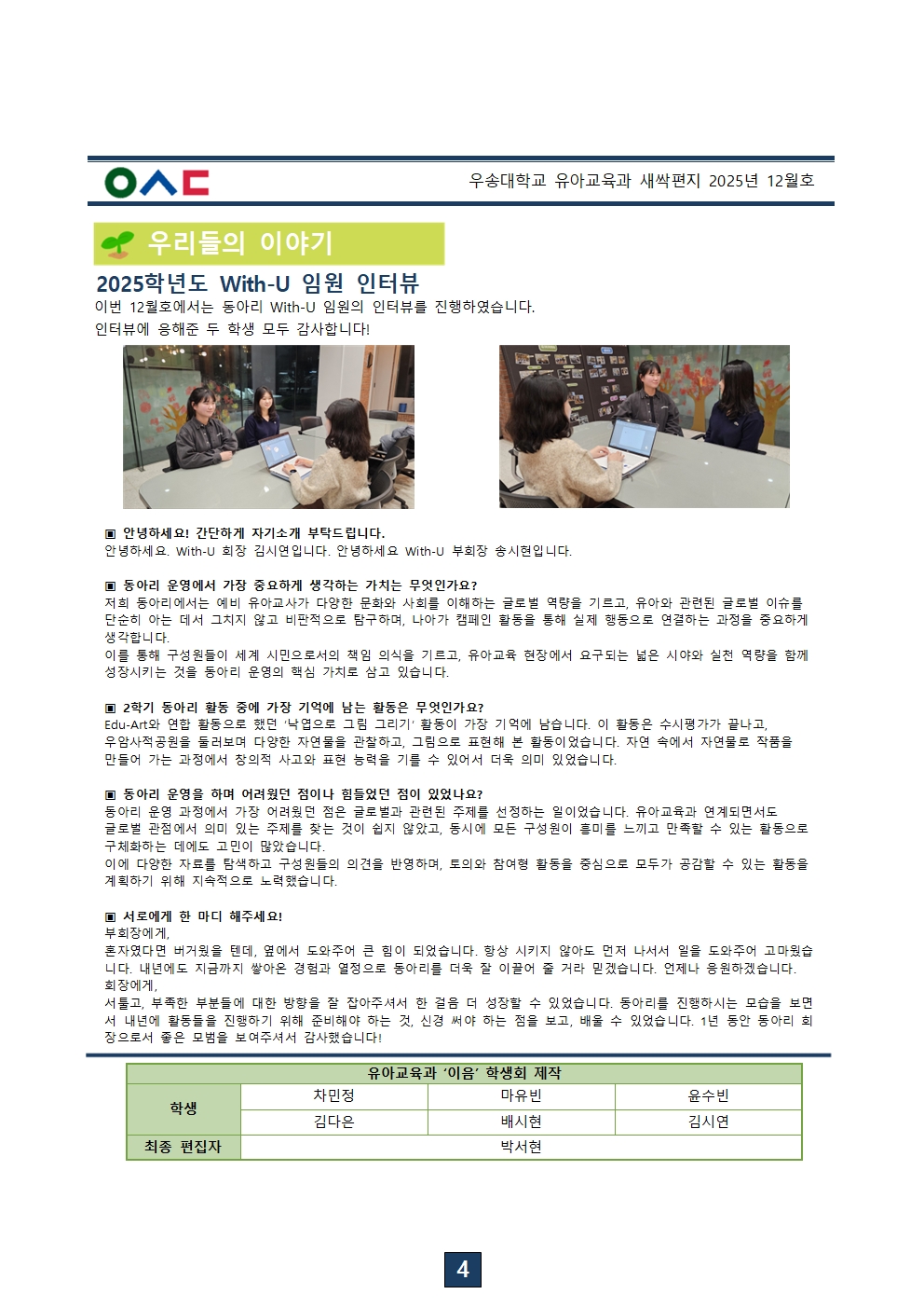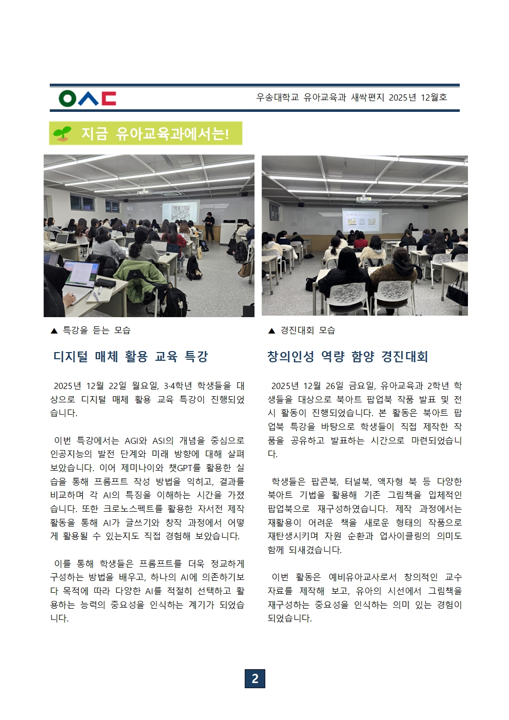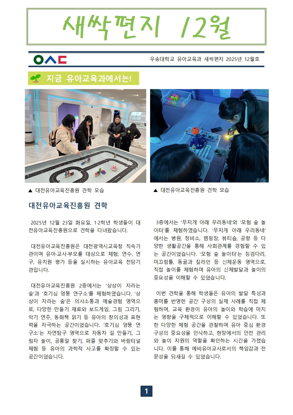 학생활동 지금유아교육과에서는! 학생들의 학과소개 글로벌프로그램 학생회 동아리 유아교육과 뉴스레터 생생 유아교육 유아교육 뉴스레터Home학생활동유아교육 뉴스레터 2025년도 새싹편지 12월호 작성자 : 학과관리자 | 작성일 : 2025.12.31 | 조회수 : 45 첨부파일 2025년도 새싹편지 12월호 001.jpg 2025년도 새싹편지 12월호 002.jpg 2025년도 새싹편지 12월호 003.jpg 2025년도 새싹편지 12월호 004.jpg 목록 이전글 이전 글이 없습니다. 다음글 2025년도 새싹편지 11월호